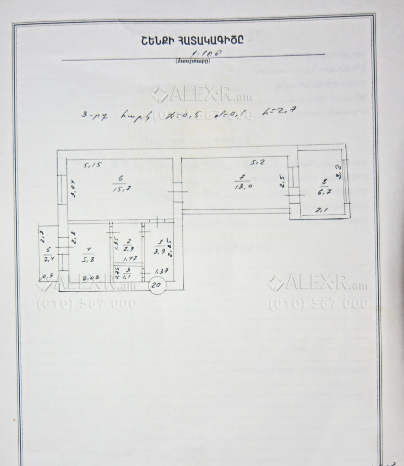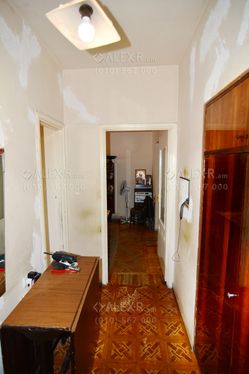 An apartment for sale in G. Artsruni Street (G. Artsruni-Vagharshyan crossroad). The rooms' quantity is 2(2bedroom and 1 hall). The apartment is in the state condition and is located on the 3rd floor of the 5-storey stone building, that is stationed on the first line. The entrance door is iron-made, the windows are wooden, the floor is covered by parquet and is tiled. The bathroom is separate and former tiled, the electric wires and pipes are newly changed. The apartment has a garage, cellar, 2 balconies, built-in closets, kitchen furniture, heating system and is supplied with constant water and gas. The entrance is from the yard. The view is directed towards the yard.
