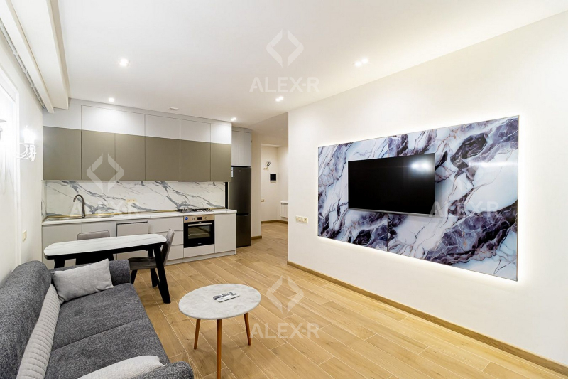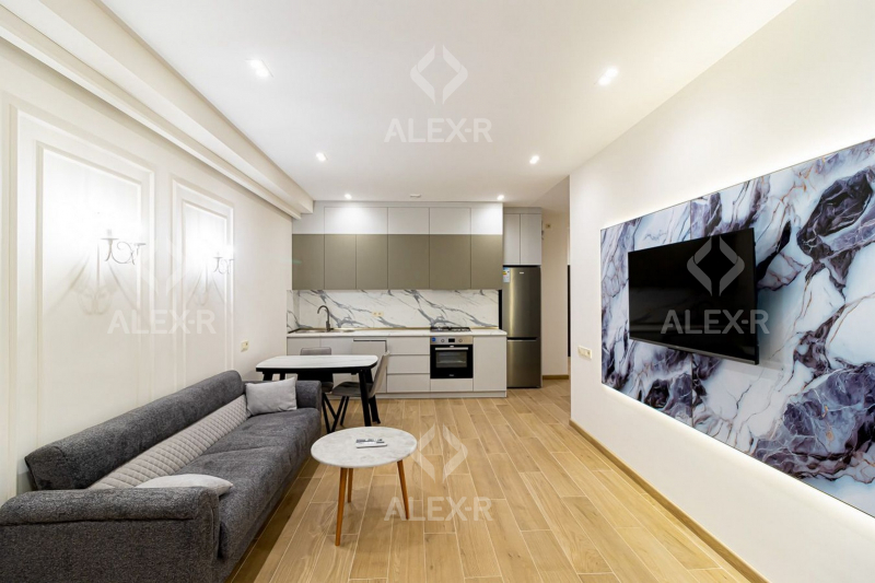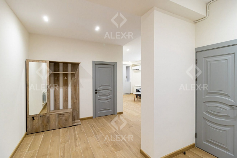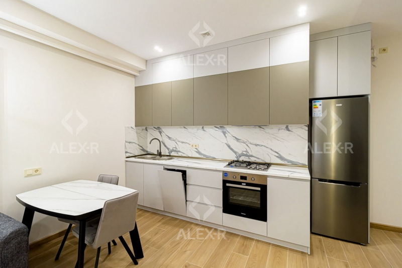 An apartment for sale or rent in K. Kerkoryan Street. The rooms' quantity is 2 (a studio and a bedroom). The apartment is modern renovated and is located on the 9th floor of the 16-storey monolith building. The entrance door is iron-made, the windows are euro-based, the floor is covered with parquet. The bathroom is combined and tiled. It has a balcony, a heating system and is supplied with water and gas. The apartment is being sold or rented with appliances and furniture.