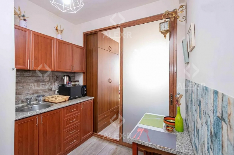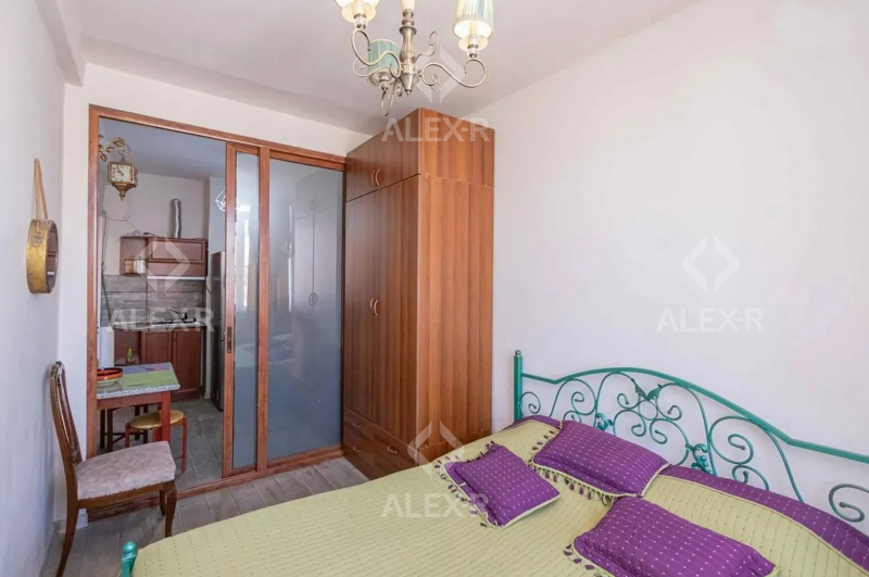 An apartment for sale in Tumanyan Street. The rooms' quantity is 2(a hall and a bedroom). The apartment is newly renovated and is located on the 9th floor of the 10-storey panel building. The entrance door is iron-made, the windows are euro-based, the floor is covered with laminate. The bathroom is combined and tiled. It has a heating system and is supplied with water and gas. The apartment is being sold furniture and appliances.