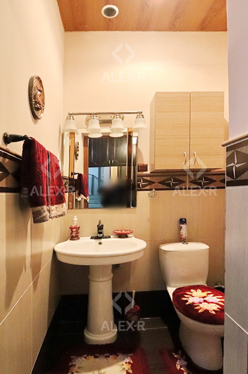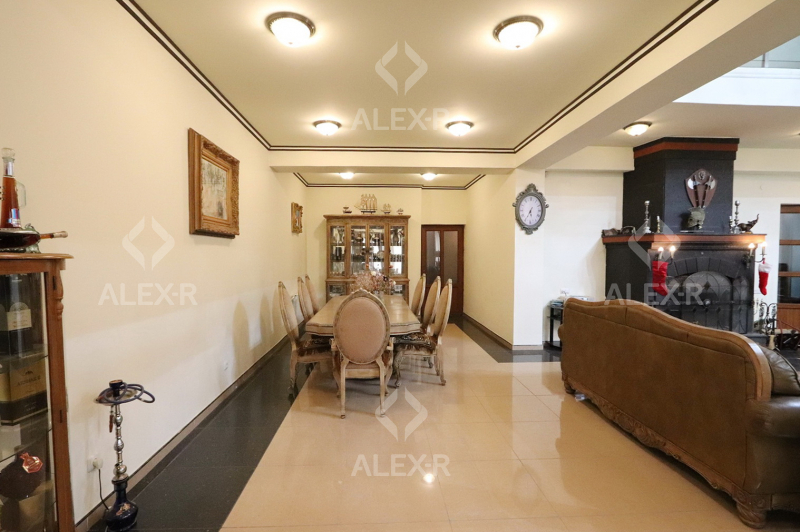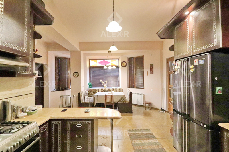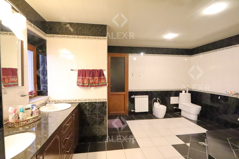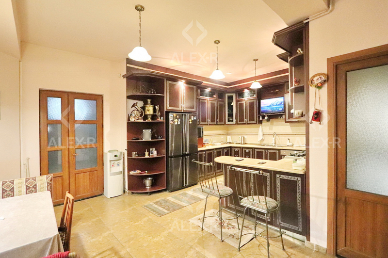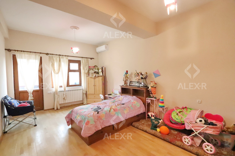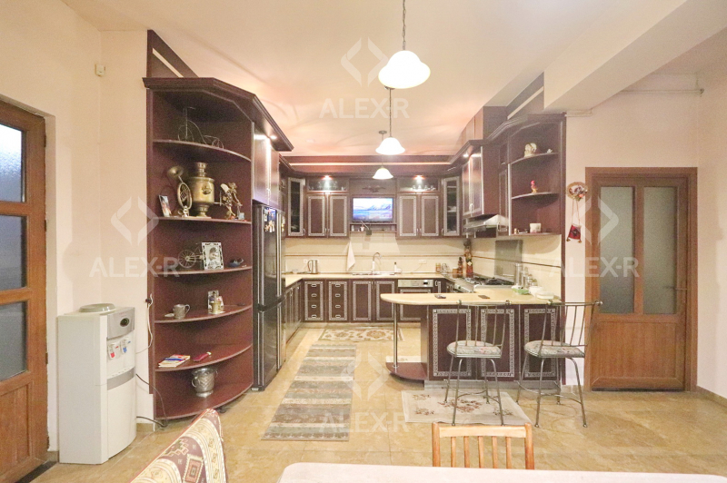 A 2-storey house for sale in Davtashen. The rooms' quantity is 8. The house is middle renovated. The entrance door is iron-made, the windows are euro-based, the floor is covered with parquet, 5 bathrooms are modern tiled. It has 3 balconies, 2 kitchens, an office room, a game room, a laundry room, a sauna, 2 dressing rooms, a storage room, a fireplace, an attic, a landscaped yard with fruitful trees and a flower garden, a pool, a summer kitchen, a cellar, a garage, a fence, an air-conditioner, a heating system and is supplied water and gas. The house is sold with furniture and appliances.